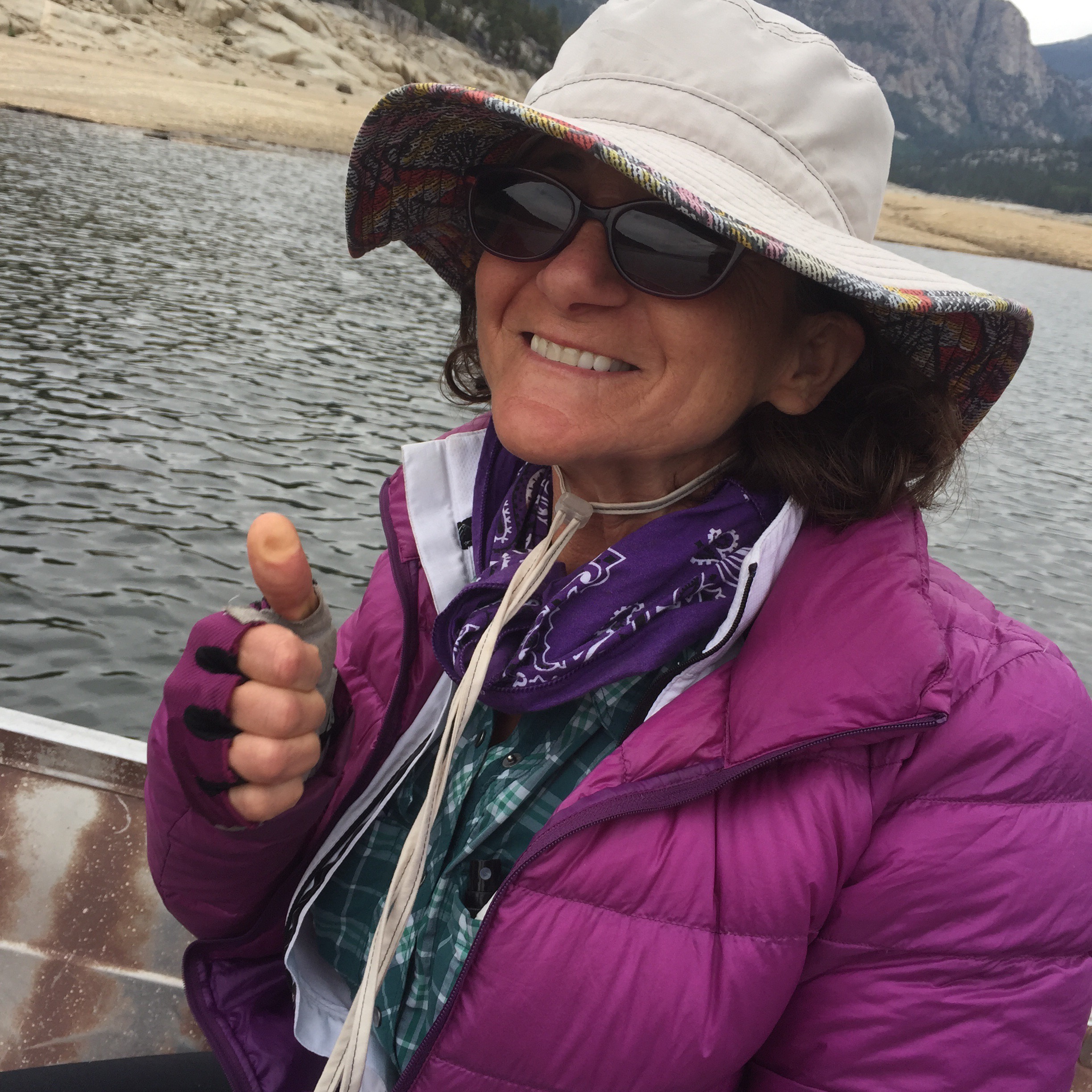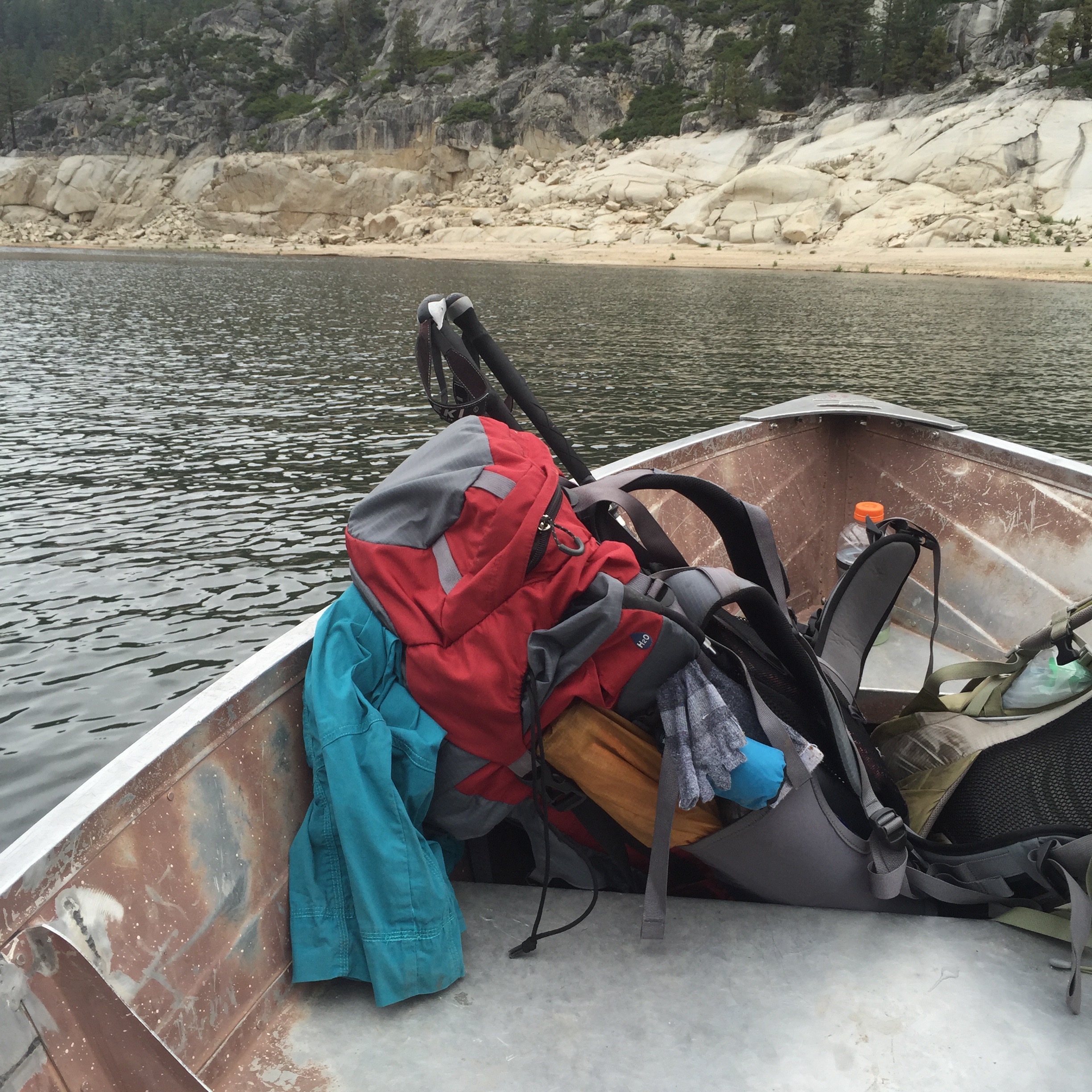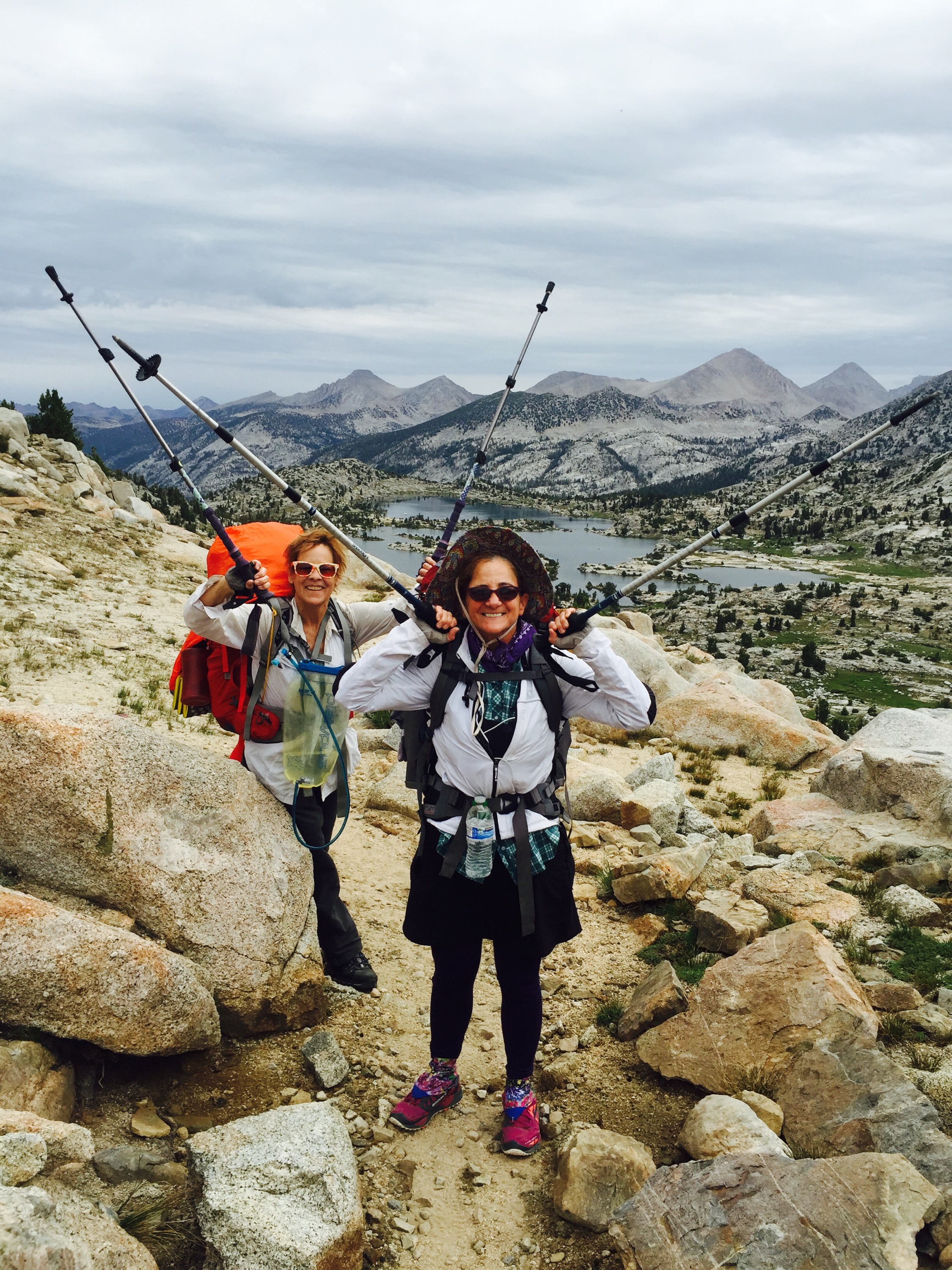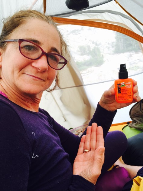We packed up and headed down to beautiful Marie Lake , a tarn rimmed by rugged mountains. We began the hateful task of feeding mosquitoes while we filtered water. Shortly, a solo female hiker, Regina, came down the trail. She appeared to be close to our age. She sat to rearrange herself and pack. She had a large water bladder hanging from the front of her neck. The liquid inside was yellow. It appeared to be a Foley catheter bag. The seat of her pants were patched with a large swatch of duct tape. We quickly became friends.