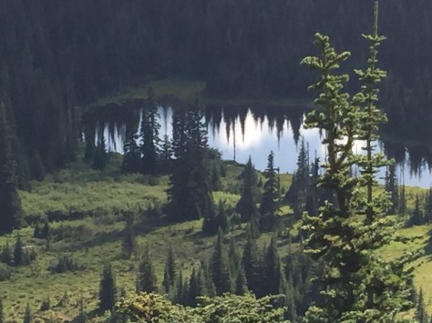 With this news, we started dashing down the trail. It was a couple miles of serious downhill switchbacks. We had leapfrogged with Regina several times when she or we had stopped. Now we were hiking closely. We came to a turn-off for Florence Lake. The three of us stopped to debate if this was the trail to MTR when the tights-wearing man came walking down the Trail. He told us he was coming from MTR, he said it was good, and it was only mile or so of all flat or gradual downhill. It started downhill and flat. We were sprinting giddily along, talking about getting gourmet items like chocolate milk, beer, French fries.
